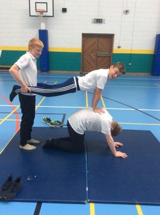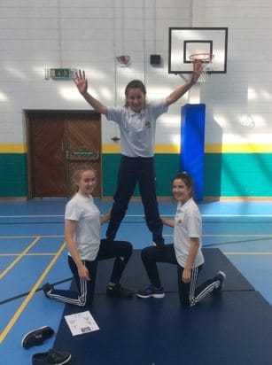 Ellie Bucke, Deirdre McMahon and Ciara Ryan enjoying PE Class. Students go head over heels in PE Class. Ms Sandra Quaid (PE Teacher) helps her First Years build a pyramid. Jamie Fahy, John Collins and AJ Dee display some Gymnastic skills in PE Class.