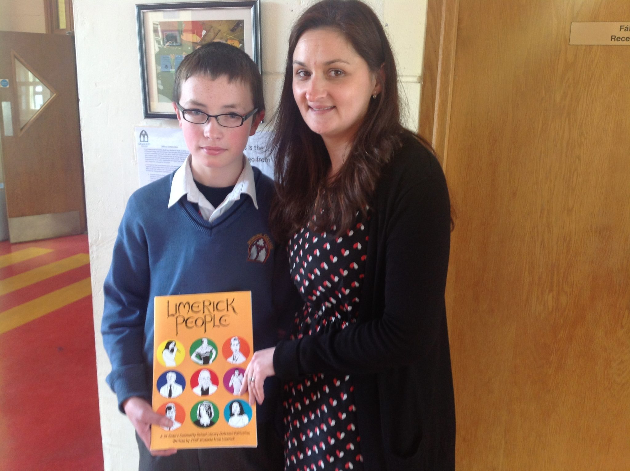 Micheal Helly, second year student in Desmond College, with his English Teacher Margaret OMahony being presented with a copy of Limerick People, a book written by young Limerick students.