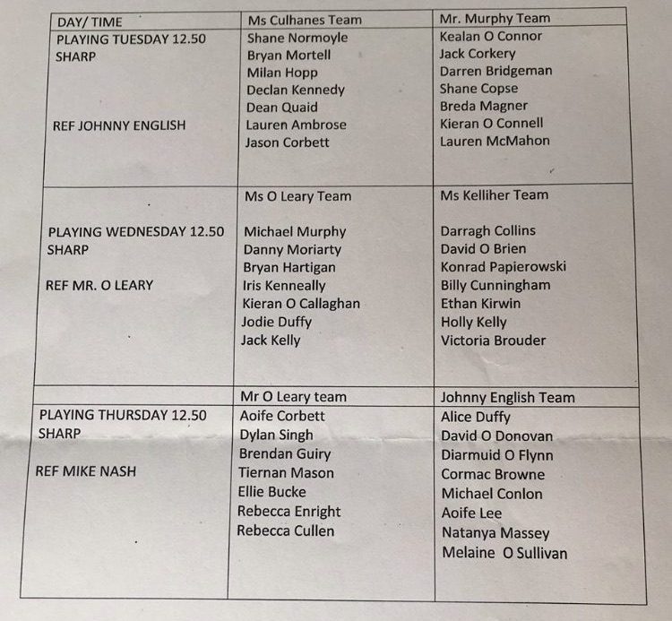 School Hurling League starts today at lunchtime. See fixtures for this week and teams below.